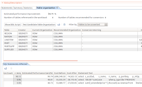 As you can see below, IOQWT analyzed six tables from my small TPC-H database. If I would convert tables to column organization (BLU Acceleration), it predicted a performance improvement of 98.79%. The most gain would be for the first query which right now has the most costs and would have least costs associated after the conversion. So DB2 with BLU Acceleration seems to make sense for my workload and by analyzing it in IOQWT I got that information without converting my database.