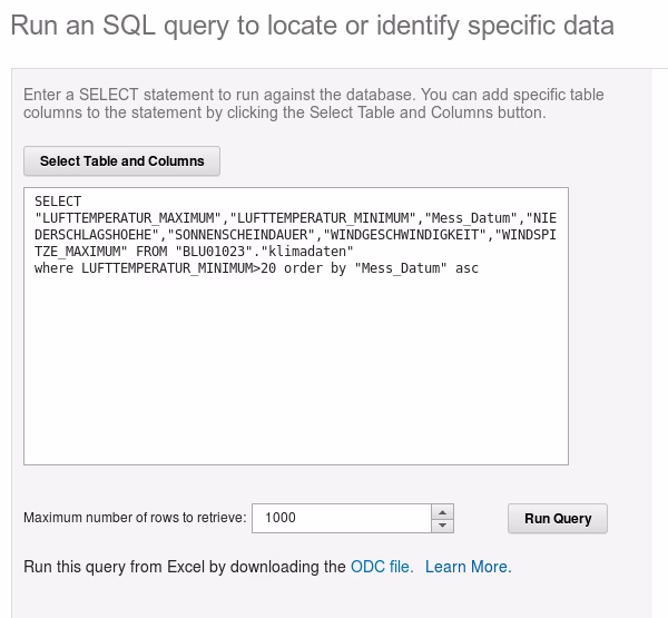 For executing (simple) selects there is a “Run Query” dialogue. It allows to choose a table and columns and then generates a basic query skeleton. I looked into whether a specific German island had warm nights, i.e., a daily minimum temperature of over 20 degrees Celsius. Only 14 days out of several decades and thousands of data points qualified.