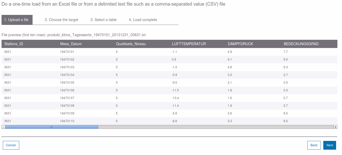 A task that I used is to (up)load data. For this I took some historic weather data (planning ahead for a vacation location), let the load wizard extract the metadata to create a suitable data, and ran some queries.