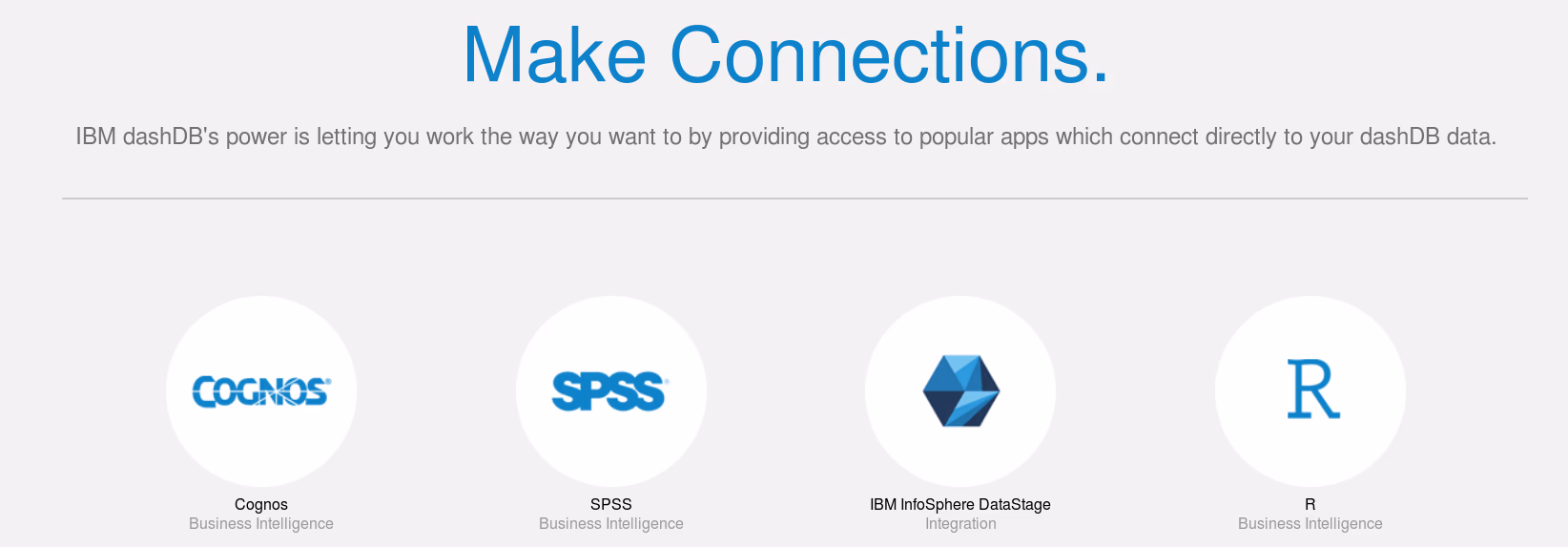 The welcome screen shows some of the analytic options, e.g., the database is ready to be used with either Cognos, SPSS, InfoSphere DataStage, R scripts, or all of them and more: