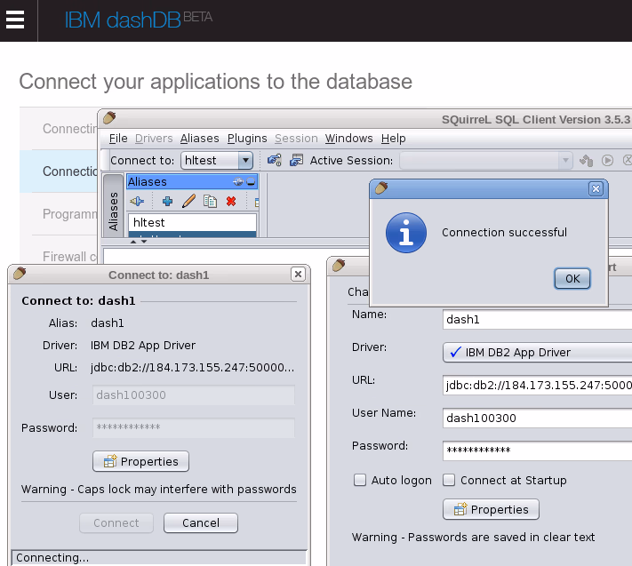This morning I took some time to take a look at dashDB, a new IBM DWaaS (Data Warehouse as a Service) offering. When you go to the dashDB website, you are offered two choices: Use the dashDB service available on IBM Bluemix or use a Cloudant account to add a warehouse to your JSON database. Let me give you a brief overview of what you can do with dashDB and how I connected a local (open source) SQuirreL SQL client to my new dashDB database.