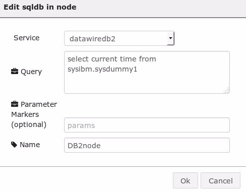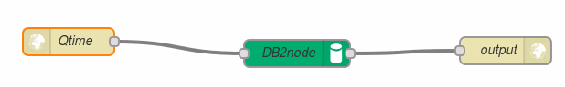 For the http nodes I only changed the name to “Qtime” and “output” and defined the URL for the input ("/currenttime"). My “DB2node” required either hard-coding a query or passing them in. In order to stay within my set 10 minute limit, I just coded up a simple query as shown: