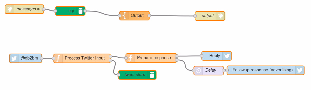 The lower flow consists of a Twitter input node to receive incoming tweets for a user. The tweet is then analyzed for known hashtag commands (Process Twitter Input). If “#archive” has been specified, some data is handed over to the SQLDB output node (green, “tweet store”). In all cases a response is prepared and then a reply tweeted, in some cases also a delayed follow-up response.