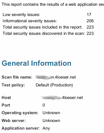As you can see, my application does not have any significant security issues. To learn more about the low and informational issues that were found in the scan I downloaded the report as PDF document. A snippet of the overview page is shown on the right.