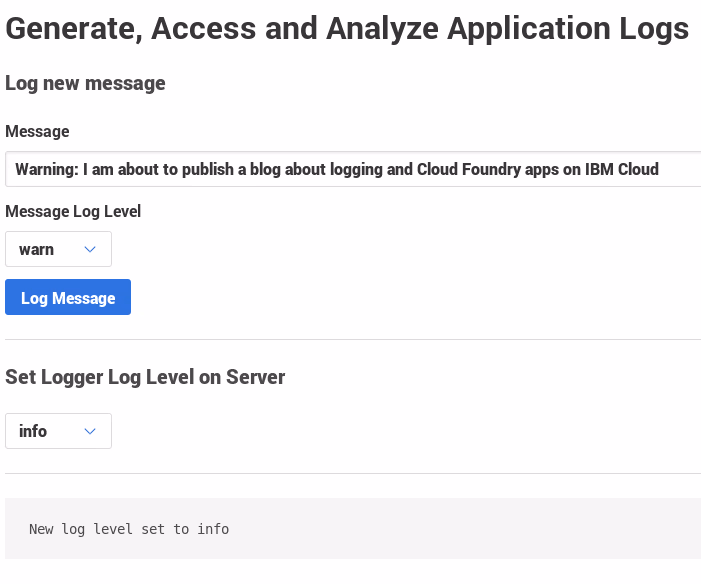 As usual, the code for my app is available on Github: https://github.com/data-henrik/application-log-analysis/. Once deployed to IBM Cloud, the app can be used to send messages on a chosen log level back to the server. The server-side log level, i.e., the threshold for processed log messages can also be set. The app produces diagnostic output on “stdout” and “stderr”. The two are treated differently by Cloud Foundry. Here is a screenshot of the logging app: