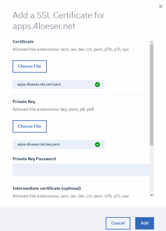 In the next step, I uploaded the certificate and private key to the IBM Cloud domain management.