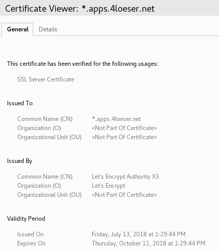 With the above commands I first fetch the code and change into the new directory. Thereafter, I invoke the certbot tool to guide me take me through the process of obtaining a certificate for “.apps.4loeser.net”. Because it includes an asteriks (), a wildcard certificate is issued.