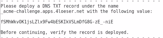 >> ./certbot-auto certonly --manual --preferred-challenges dns --server https://acme-v02.api.letsencrypt.org/directory --email domains@4loeser.net --domains *.apps.4loeser.net --no-bootstrap