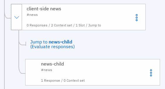 The chatbot core is a simple dialog in Watson Assistant. A dialog node “client-side news” reacts to a detected “news” intent. The search phrase for the news items needs to be quoted and is defined as a pattern-based entity.
