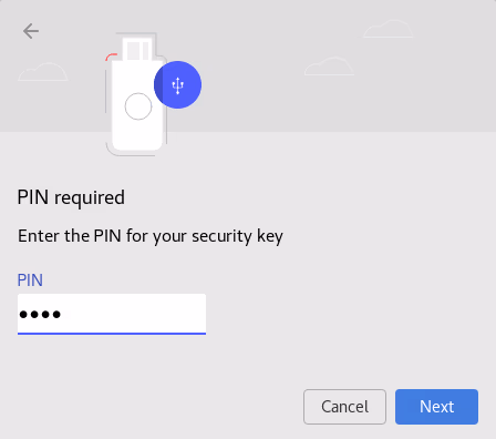 After enabling the support, I tested the app. There, I was offered to sign in without a password (see first screenshot). Next, I was prompted to insert and touch the security key. Once done, when using a device without fingerprint scanner, I needed to enter the PIN for the USB dongle: