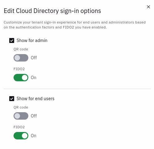 With the recently added FIDO2 support in Cloud Identity and the new option to enable passwordless logins, going passwordless for the app was merely finding and activating the right options. As CI administrator, I navigated to the security settings and the new tab “Sign-in options”. There, I could enable FIDO2 support for users of the integrated Cloud Directory (user management):