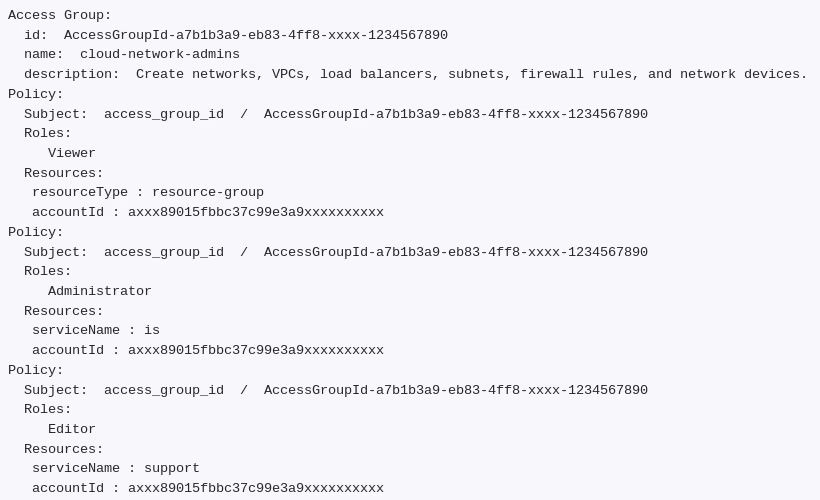 After reading in the API key, it turns it into an IAM bearer token and retrieves the associated account_id, then first fetches the access groups related to the identity or the entire account. For each group, it fetches and prints the policies. Thereafter, all policies directly related to the identity are retrieved and printed. All that is needed is an API key and (optionally) the IAM ID of the user or service ID. The GitHub repository has instructions on how to create the API key and obtain the IAM IDs for users and service IDs.