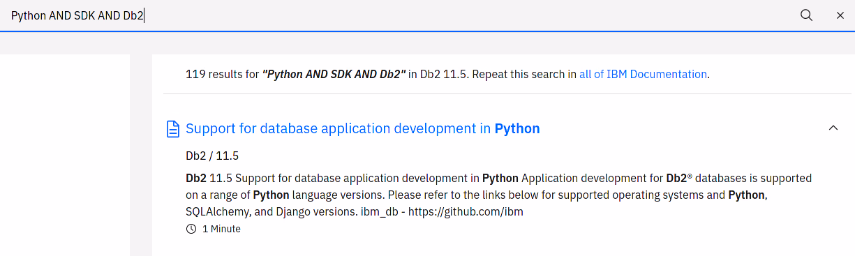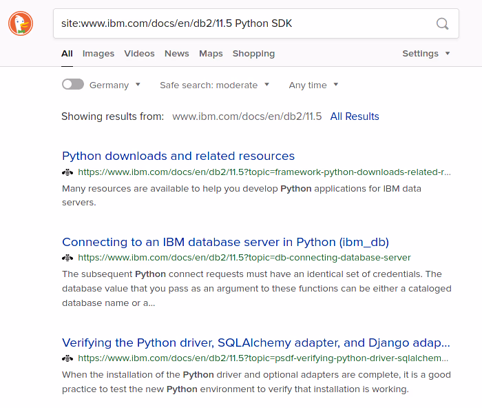 But did you know that you could optimize it by telling most search engines what / where to search? Use the term site:www.ibm.com/docs/en/db2/11.5 to scope the search to the Db2 11.5 documentation only. Searching for the Python SDK in the Db2 11.5 documentation with DuckDuckGo gives this result: