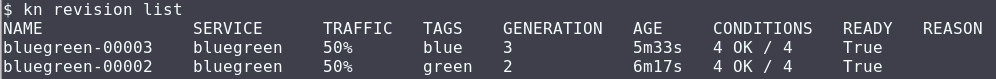 Next, I assigned the tags blue and green to the new revisions. It is not needed, but helps to remember the role of each revision. The kn service update command is the key to this and the next step.