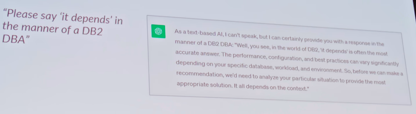The conference followed the proven schedule of keynotes starting the two first two days. After the formal opening, Julian Stuhler - at his last IDUG, he retired - gave an insightful talk about Db2 and IDUG. Looking back at technologies, products, and services gone over the past decades, new business challenges and demands, Julian demonstrated how Db2 has evolved, adapted and maintained its capability to power mission-critical workloads. Towards the end of his keynote, Julian looked into AI and what can / could be done with the power of AI today. It includes writing and optimizing SQL queries, but also this expanded version of “it depends”: